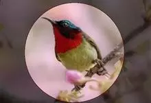 绿喉太阳鸟:共有9个亚种。小型鸟类,雄鸟体长13-15厘米、雌鸟10-12厘米。雄鸟前额至后颈、颏和喉辉绿色,头侧黑色,颈侧和背暗红色,两肩、下背橄榄绿色,腰鲜黄色,尾上覆羽和中央尾羽暗绿色,…全部>>