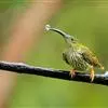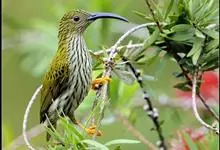 纹背捕蛛鸟:为太阳鸟科捕蛛鸟属的鸟类。是太阳鸟科中体型较大的一种,体重25-45克,体长160-210毫米。嘴粗长而尖且向下弯曲。上体橄榄黄色具黑色中央斑纹。下体淡黄白色满布黑色纵纹,尾具黑色次端斑。…全部>>
