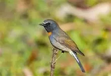 棕胸蓝姬鹟:属小型鸣禽,体长10-13厘米,体重6-10克,是一种体型很小的灰蓝及棕色鹟,雌雄羽色不同,雄鸟羽色艳丽,雌鸟羽色暗淡。雄鸟上体深蓝色,胸橙黄色,下腹灰白色。亚成鸟具褐色斑驳。…全部>>