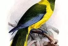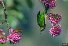 橙腹叶鹎体形大小和金额叶鹎相似,体长16~20厘米。额至后颈黄绿色,其余上体绿色,小覆羽亮钴蓝色,形成明显的肩斑。颏、喉、上胸黑色具钴蓝色髭纹,其余下体橙色。飞羽和尾羽雄鸟黑色、雌鸟绿色。…全部>>