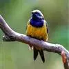 金额叶鹎是和平鸟科、叶鹎属的鸟类。体长16-20厘米。额和头顶前部金桔色,整个上体包括两翅表面草绿色。颏、喉黑色,其外围有一圈黄色,其余下体浅绿色,翼缘蓝紫色,翅上小覆羽翠蓝色。野外特征极明显,…全部>>