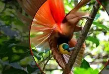 大极乐鸟是极乐鸟属中最大的鸟种。成年雄鸟体长可达到43厘米,雌性可达35厘米。雄鸟的额、颊、喉等墨绿色;头、颈黄色;上体暗赤栗色;腹部葡萄红色,胁部有长饰羽,其基部橙黄,中部黄色,…全部>>