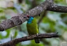 蓝喉拟啄木鸟,是须鴷科、拟啄木鸟属的鸟类。蓝喉拟啄木鸟为小型鸟类,体长20-23厘米。前额至头顶鲜红色,其上有一宽阔的黑色横带,将此红色分为前后二块;头侧、颏、喉蓝色,下喉两侧各具一红色点斑。…全部>>