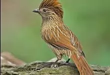 条纹噪鹛是画眉科、噪鹛属中型鸟类,体长28-32厘米。头具短的羽冠,上体栗褐色,飞羽外翻蓝灰色。下体棕栗色,腹以后转为褐白色。除飞羽和尾羽外,所有上、下体羽均具白色羽干纹。极为醒目。野外特征明显,…全部>>