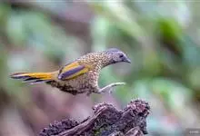 橙翅噪鹛:是噪鹛科、彩翼噪鹛属的中型鸟类,体长22-25厘米。头顶深葡萄灰色或沙褐色。上体灰橄榄褐色,外侧飞羽外翈蓝灰色、基部橙黄色,中央尾羽灰褐色,外侧尾羽外翈绿色而缘以橙黄色并具白色端斑。…全部>>