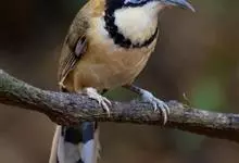 黑领噪鹛是雀形目画眉科噪鹛属鸟类,又名领笑鸫。头顶和上体褐色;眼先和眉纹白色;脸部具黑白相间的纵纹;颈侧至胸前具显著的黑色宽带,形成一半领环,其后方的颈背向下至两胁皆为棕黄色,其余下体白色;尾褐色,…全部>>