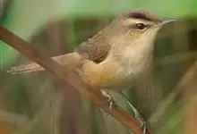 黑眉苇莺:体重7-11克,体长11-13厘米。上体橄榄棕褐色;眉纹淡黄色,杂有明显黑褐色纵纹;第2枚初级飞羽较第6枚短;下体白色,两胁暗棕色。虹膜暗褐色;嘴黑褐色,下嘴基淡褐色;脚暗褐色。…全部>>