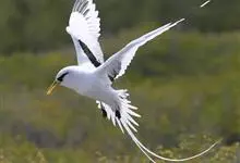 白尾鹲:体重220-410克;体长370-400毫米,加上延长的尾羽为680-990毫米,是一种中型热带海鸟。全身羽毛主要为白色,繁殖期微缀有橙色。眼前和眼后有粗著的黑色斑,像两条粗黑的眼眉。…全部>>