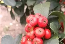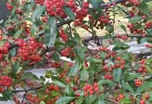 火棘 H. L. Li)是蔷薇科火棘属常绿灌木,老枝呈暗褐色;叶片呈倒卵形,边缘有钝锯齿,齿尖向内弯,两面皆无毛;叶柄短,无毛或嫩时有柔毛;花序是复伞房状,花瓣呈白色近圆形;果球近圆形,…全部>>