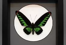翠叶红颈凤蝶是凤蝶科红颈凤蝶属的一种大型蝴蝶,该物种共有11个亚种。因其脖子上有一圈红色的绒毛,故称“红颈鸟翼蝶”。也因为翅面上绿色斑纹酷似树木绿色的叶片又名“翠叶凤蝶”。蝶翅上遍布金绿色鳞片,…全部>>
