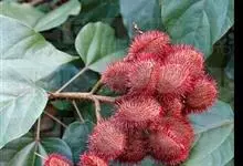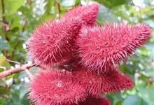 红木是红木科红木属常绿灌木或小乔木,高可达10米,叶片心状卵形或三角状卵形,叶柄长2.5~5厘米,无毛;圆锥花序顶生,花序梗粗壮,萼片和花瓣倒卵形;蒴果近球形或卵圆形,密生栗褐色长刺;种子卵圆形,…全部>>