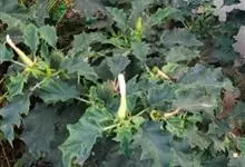 洋金花是茄科曼陀罗属植物,一年生草本植物,全株近于无毛。茎直立,圆柱形,高30~100cm,基部木质化,上部呈义状分枝。叶互生,上部的叶近于对生;叶柄长2~6cm,表面被疏短毛;叶片卵形、长卵形或心形,…全部>>