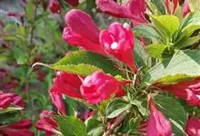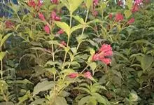 红王子锦带花是忍冬科锦带花属的落叶开张性灌木。株高1 -2米;嫩枝淡红色,老枝灰褐色;单叶对生,呈椭圆形,先端渐尖,叶缘有锯齿,红枝及叶脉具柔毛;花冠漏斗状钟形,花冠筒中部以下变细,聚伞花序,…全部>>