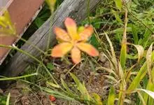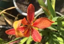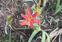 射干 Redouté)是鸢尾科射干属多年生草本植物。根状茎为不规则的块状,斜黄色或黄褐色;花橙红色,散生紫褐色的斑点;花药呈条形;子房下位,倒卵形;蒴果倒卵形或长椭圆形;种子圆球形,黑紫色,有光泽。…全部>>