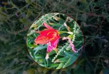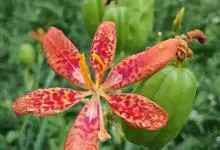射干 Redouté)是鸢尾科射干属多年生草本植物。根状茎为不规则的块状,斜黄色或黄褐色;花橙红色,散生紫褐色的斑点;花药呈条形;子房下位,倒卵形;蒴果倒卵形或长椭圆形;种子圆球形,黑紫色,有光泽。…全部>>
