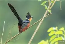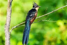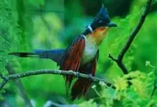 红翅凤头鹃:体长约38厘米,顶冠及凤头黑色,具显眼的直立凤头,背及尾黑色而带蓝色光泽,翅栗红色,喉及胸橙褐色,颈圈白色,腹部近白。虹膜淡红褐色。嘴黑色,下嘴基部近淡土黄色,嘴角肉红色,脚铅褐色。…全部>>