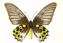 荧光裳凤蝶是凤蝶科裳凤蝶属的一种大型蝴蝶,该物种共有3个亚种。该蝶飞翔的时候姿态优美,前翅黑色,后翅金黄色和黑色交融的斑纹在阳光照射下金光灿灿,显得华贵美丽。幼虫寄主为多种马兜铃属的植物,取食马兜铃…全部>>