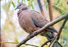 棕斑鸠,是鸽形目鸠鸽科斑鸠属鸟类。整个头和颈淡粉红色,头顶和前额较暗,颊、喉较淡,前颈基部两侧羽毛黑色具宽阔的棕色端斑,使前颈两侧形成黑色斑点状的黑斑。…全部>>