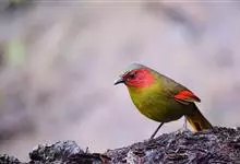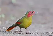 红翅薮鹛是噪眉科、薮鹛属中型鸟类,体长21-24厘米。头顶灰褐色,头侧和颈侧赤红色,上体橄榄褐色,翅上具红色块斑,尾具红色或橙黄色块斑,下体灰色沾褐。虹膜褐色或红色,嘴黑色,脚暗褐色或淡灰褐色。…全部>>