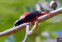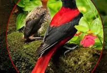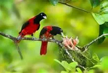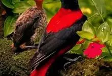 朱鹂:中等鸟类,体长23-28厘米。雄鸟绛紫红色,头、上胸及翼黑色。雌鸟上背及背部深灰色,尾覆羽及尾绛紫红色,腹部及下胸白而密布黑色纵纹。与鹊色鹂幼鸟的区别在上背灰色较深,下体白色较少且纵纹较粗。…全部>>