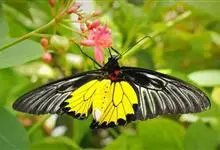 金裳凤蝶是凤蝶科、裳凤蝶属的动物。金裳凤蝶身体呈黑色,头、颈和胸侧有红毛,腹部有黑黄两色相间条纹,雄蝶前翅黑色,具黑天鹅绒光泽,各脉两侧灰白色,后翅金黄色,各室外缘有等腰三角形黑斑1枚,斑内侧有晕,…全部>>