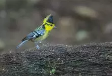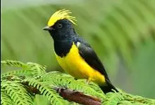 冕雀:共有4个亚种。体长20-21厘米,体重34-49克。具蓬松的黄色长型冠羽。雌鸟似雄鸟,但喉及胸深橄榄黄色,上体沾橄榄色。不会被误认的体大的黄色及黑色山雀。混群栖于原始林及次生林的林冠层,…全部>>