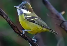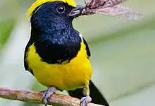 冕雀:共有4个亚种。体长20-21厘米,体重34-49克。具蓬松的黄色长型冠羽。雌鸟似雄鸟,但喉及胸深橄榄黄色,上体沾橄榄色。不会被误认的体大的黄色及黑色山雀。混群栖于原始林及次生林的林冠层,…全部>>