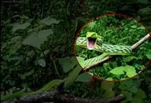 绿瘦蛇是游蛇科,瘦蛇属轻毒性后沟牙毒蛇。体型极细而长,长可达1.5米。头较窄长,与颈区分极明显;吻端略圆而平扁,超出下领;眼大,瞳孔呈一横缝;颊区呈一凹槽;躯干瘦长侧扁,尾甚长而细。背面鲜绿色,…全部>>