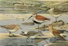 泽鹬:小型涉禽,体长19-26厘米。嘴长,相当纤细,直而尖。颜色为黑色,基部绿灰色,脚细长,暗灰绿色或黄绿色。夏季上体灰褐色具黑色斑,腰白色并向下呈楔形延伸。下体白色,颈、胸具细的黑色纵纹。…全部>>