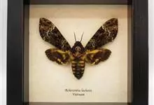 鬼脸天蛾,是鳞翅目天蛾科面形天蛾属动物。成虫翅展100~125毫米,体黑褐色;胸背有骷髅形斑纹;卵圆球形,直径约2毫米,淡黄绿色,表面光滑;老熟幼虫体长70~90毫米,蛹体长约56毫米;前翅为褐色,…全部>>