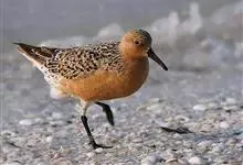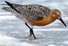 红腹滨鹬,是鹬科、滨鹬属的小型涉禽,体长23-25厘米,嘴较短而直、黑色,脚亦甚短、绿色。体较粗胖。夏季上体灰褐色具黑色中央纹,背具棕栗色和白色斑纹和羽缘,头侧和整个下体栗红色。冬季棕红色消失,…全部>>