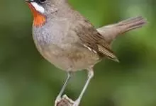 红点颏:是鸟纲、鹟科的鸣禽。又名西伯利亚歌鸲。体长14-17厘米,体重16-27克。雄鸟头部、上体主要为橄榄褐色。眉纹白色。颏部、喉部红色,周围有黑色狭纹。胸部灰色,腹部白色。雌鸟颏部、喉部不呈赤红色,…全部>>