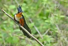红翅凤头鹃:体长约38厘米,顶冠及凤头黑色,具显眼的直立凤头,背及尾黑色而带蓝色光泽,翅栗红色,喉及胸橙褐色,颈圈白色,腹部近白。虹膜淡红褐色。嘴黑色,下嘴基部近淡土黄色,嘴角肉红色,脚铅褐色。…全部>>