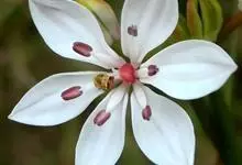 花蔺,为花蔺科花蔺属多年生水生草本。根茎粗壮横生。叶基生,上部伸出水面,线形,三棱状,基部成鞘状。 花:花茎圆柱形,直立,有纵纹。花两性,成顶生伞形花序。外轮花被3,带紫色,宿存;内轮花被3,淡红色…全部>>