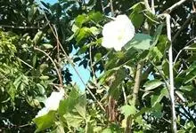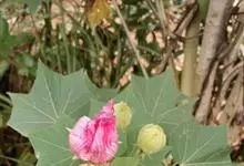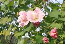 木芙蓉,锦葵科木槿属落叶灌木或小乔木。小枝上有细绒毛;叶片为卵状心形,托叶为披针形,常早落;花单生,花萼为钟形,花冠初为白色或淡红色,后逐渐变为深红色;果实为扁球形,有淡黄色的毛附着。花期8到10月。…全部>>