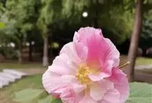 木芙蓉,锦葵科木槿属落叶灌木或小乔木。小枝上有细绒毛;叶片为卵状心形,托叶为披针形,常早落;花单生,花萼为钟形,花冠初为白色或淡红色,后逐渐变为深红色;果实为扁球形,有淡黄色的毛附着。花期8到10月。…全部>>