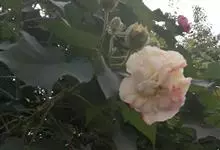 木芙蓉,锦葵科木槿属落叶灌木或小乔木。小枝上有细绒毛;叶片为卵状心形,托叶为披针形,常早落;花单生,花萼为钟形,花冠初为白色或淡红色,后逐渐变为深红色;果实为扁球形,有淡黄色的毛附着。花期8到10月。…全部>>