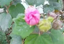 木芙蓉,锦葵科木槿属落叶灌木或小乔木。小枝上有细绒毛;叶片为卵状心形,托叶为披针形,常早落;花单生,花萼为钟形,花冠初为白色或淡红色,后逐渐变为深红色;果实为扁球形,有淡黄色的毛附着。花期8到10月。…全部>>