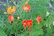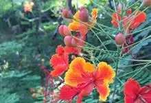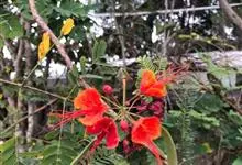 洋金凤 Sw.),豆科小凤花属灌木状或小乔木植物,枝无毛,绿或粉绿色;二回羽状复叶;总状花序伞房状,萼片无毛,花瓣橙红或黄色,圆形,花丝红色,子房无毛,花柱橙黄色;荚果窄而薄,…全部>>