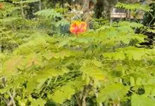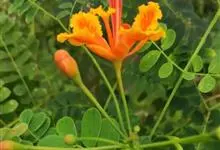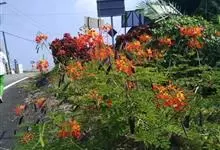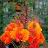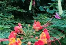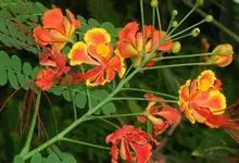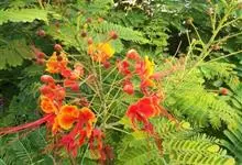 洋金凤 Sw.),豆科小凤花属灌木状或小乔木植物,枝无毛,绿或粉绿色;二回羽状复叶;总状花序伞房状,萼片无毛,花瓣橙红或黄色,圆形,花丝红色,子房无毛,花柱橙黄色;荚果窄而薄,…全部>>