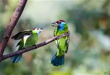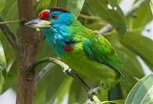 蓝喉拟啄木鸟,是须鴷科、拟啄木鸟属的鸟类。蓝喉拟啄木鸟为小型鸟类,体长20-23厘米。前额至头顶鲜红色,其上有一宽阔的黑色横带,将此红色分为前后二块;头侧、颏、喉蓝色,下喉两侧各具一红色点斑。…全部>>
