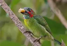 金喉拟啄木鸟,是须鴷科、拟啄木鸟属的鸟类。金喉拟啄木鸟为小型鸟类,体长19-24厘米。额深红色,头顶金黄色,后枕具一大块深红色斑,耳羽和头侧银灰色,上体草绿色,颏和上喉金黄色,下喉淡银灰色,…全部>>