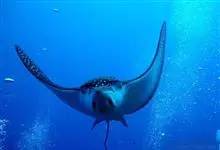 蝠鲼,又被称为魔鬼鱼与毯魟。属于软骨鱼纲、蝠鲼科,它包含两个属,前口蝠鲼属和蝠鲼属。体呈菱形,宽达6m余。体青褐色。口宽大。眼下侧位,能侧视和俯视。头侧有1对有胸鳍分化的头鳍,向前突出。背鳍小,…全部>>