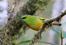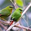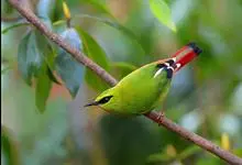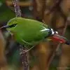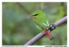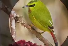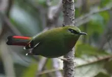 火尾绿鹛是莺科、绿鹛属小型鸟类,体长11-14厘米。上体绿色,头顶至枕具黑色鳞状斑,眼先和眼后黑色,眉纹黄绿色。两翅黑色具黄色和红色翅斑及白色端斑,极为醒目。中央一对尾羽绿色,外侧尾羽鲜红色。…全部>>