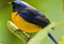 棕腹大仙鹟:体重24-28克,体长15-17厘米,是一种小型的色彩亮丽的鹟。雄鸟上体深蓝,下体棕色,脸黑,额、颈侧小块斑、翼角及腰部亮丽闪辉蓝色。与棕腹仙鹟易混淆,区别在色彩较暗。雌鸟灰褐,…全部>>