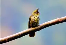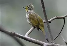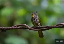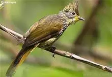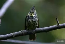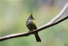 纵纹绿鹎,是鹎科鹎属的一种动物,是体型中等大小鸟类,体长20-24厘米。头绿褐色具明显的冠羽,其上具细的白色纵纹。上体橄榄绿色具细的白色纵纹。眼圈浅黄色。喉和尾和覆羽黄色,其余下体暗灰黑色具黄白色纵纹。…全部>>