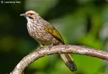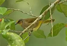 纹喉鹎:体长19厘米,是一种中等体型的偏绿色鹎。特征为头顶、脸颊、颏及喉均具黄色条纹。上体橄榄绿色。胸腹暗灰色,肛周和尾下覆羽艳黄。不可能与任何其他鹎类混淆。虹膜褐色;嘴黑色;脚粉褐色。…全部>>