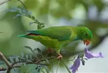 虹彩吸蜜鹦鹉共有21个亚种,体长25-30厘米,羽色鲜艳。体重120-130克。嘴为桔红色,脚为蓝灰色。头顶、下颌及脸颊部为深蓝色。枕部和颈上部有紫褐色和黄绿色的环带。背部、翅膀和尾羽为绿色。胸部为…全部>>