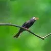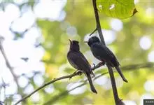 蓝翅叶鹎:小型鸟类,体长15-18厘米。雄鸟通体草绿色,尾蓝绿色,肩和翅亮蓝 色,胸缀有黄色,颏、喉黑色。雌鸟颏,喉蓝绿色。栖息在海拔1500米以下的常绿阔叶林、次生林和林缘疏林灌丛中。…全部>>