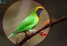 金额叶鹎是和平鸟科、叶鹎属的鸟类。体长16-20厘米。额和头顶前部金桔色,整个上体包括两翅表面草绿色。颏、喉黑色,其外围有一圈黄色,其余下体浅绿色,翼缘蓝紫色,翅上小覆羽翠蓝色。野外特征极明显,…全部>>